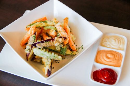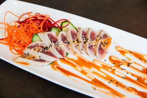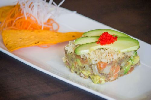 Salmon, crab stick and spicy tempura, topped with salmon, tuna, avocado and blueberry. Saumon, goberge et tempura épicé, garni de saumon, thon, avocat et myrtille.
