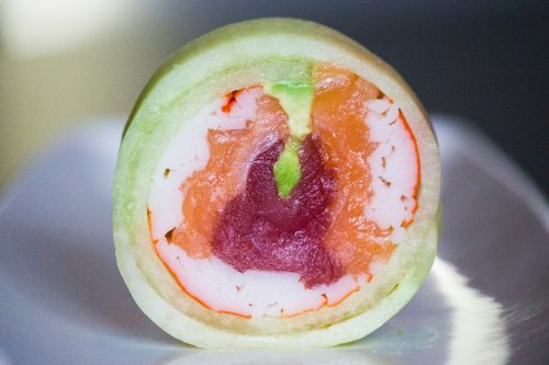 No rice on noori ,crab,salmon tuna letuce avocado crunchy onion, mango roll with salmon tuna avocado cavier yami sauce on top.