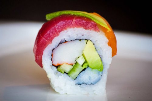 Fried crab stick, avocado and spicy tempura, covered with crab stick. Bâtonnet de crabe frit, avocat et tempura épicé, recouvert de Bâtonnet de crabe.