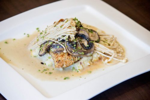 Salmon fillet crusted with pecans, orange citrus sauce,potato puree and sauteed vegetables