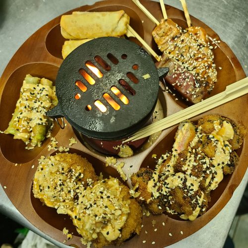 Slices of seared tuna and cucumber dressed with ponzu sauce and yami sauce. Tranches de thon grillé et concombre, garnies de sauce ponzu et de sauce yami.